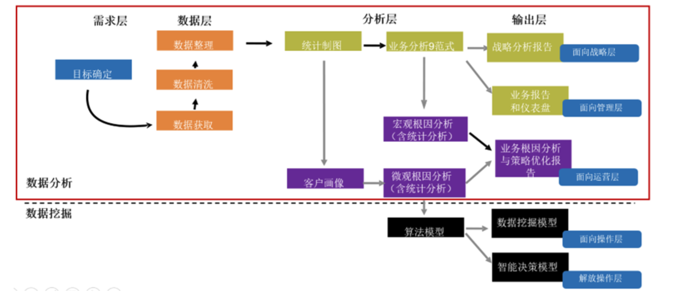 其中“业务检测”包括KPI指标体系的构建和可视化分析能力,“诊断”涉及定性和定量根因分析和研究报告编写,“指导”包括客户画像、产品画像和策略模版的使用,“工具”包括金融行业定制化的九大数据挖掘模版的学习和使用。