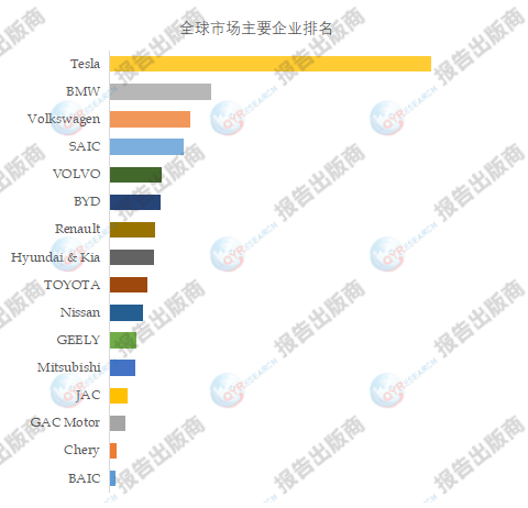 全球范围内零排放汽车生产商主要包括Tesla、BMW、Volkswagen、SAIC、VOLVO、BYD、Renault、Hyundai & Kia、TOYOTA 、Nissan等。2021年,全球前五大厂商占有大约50.0%的市场份额。