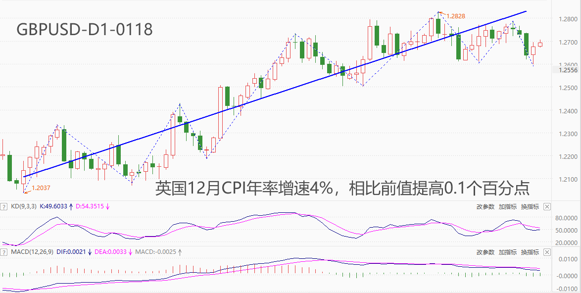 ATFX汇市:开年以来,随着美元指数持续反弹,大部分非美货币承压贬值,只有英镑表现出较强的抗跌属性。支撑英镑币值坚挺的原因之一,就是英国尚未完全消退的高通胀问题。货币政策角度看,英央行降息的时间点越是滞后于美联储,英镑对美元升值的可能性越高。欧美国家央行调整货币政策的核心依据是通胀率变化。根据英国国家统计局数据,英国12月CPI年率4%,相比前值3.9%高出0.1个百分点,预期值为3.8%,这是10个月来英国通胀率首次上升,英国的高通胀有抬头迹象。12月核心CPI年率维持5.1%不变,意味着英国的高通胀主要是由食品和能源等周期性品种的价格走势主导。