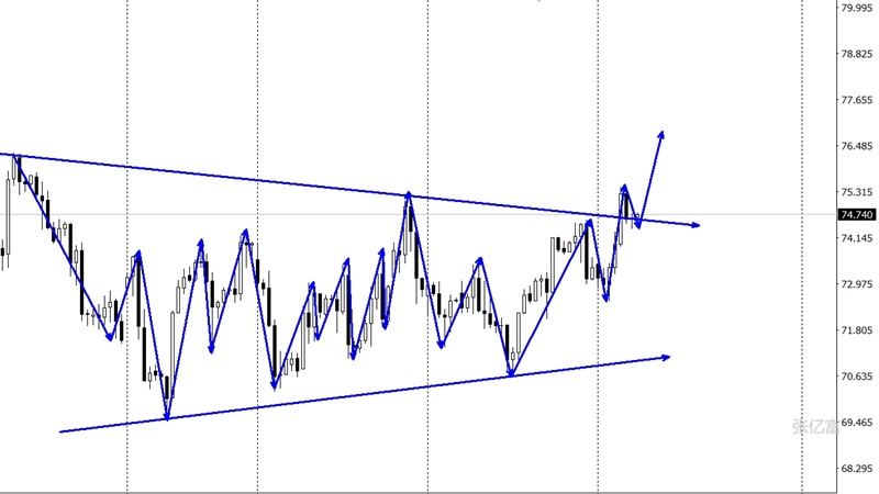 原油今日出现了高开低走走势,最高点触及75.2美元遇阻回撤,最低点触及73.3美元企稳震荡。原油日线收录一根小阳线,反复冲击高点当中,但能否突破是决定空间延续的关键,近期一直围绕区间内反复拉锯震荡,突破后的延续才能打开上方空间。4小时图目前在反复冲高,但是低点抬高,所以油价震荡向上突破的概率较大。综合以上分析,张亿富认为:原油震荡后再次向上攻击,后市操作上考虑回撤布局多单为主,高空为辅,上方关注75.7-76.5美元阻力,下方关注73.5-72.5美元支撑。今日实盘在74.0-73.7-73.3区域布局多单,获利在74.6一带。