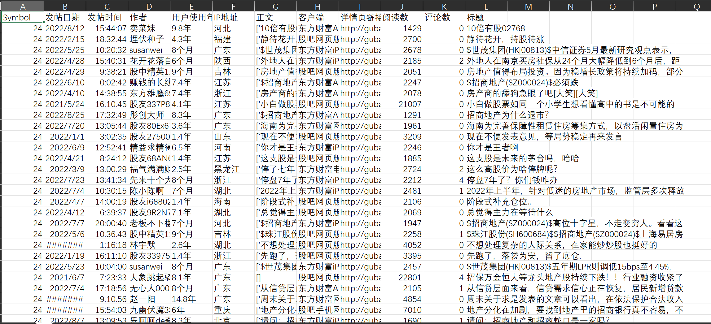 包含:发帖日期,发帖具体时间,用户名,用户使用年限,用户IP地址,帖子正文,帖子标题,帖子情绪,阅读数量,帖子评论数量等指标。