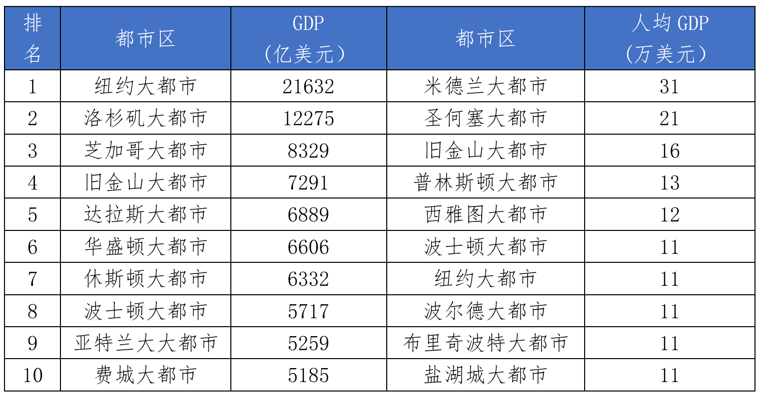 表2 2022年美国城市中GDP最高和人均GDP最高的10座都市区