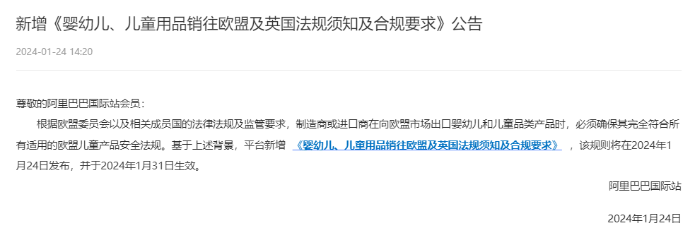 根据欧盟委员会以及相关成员国的法律法规及监管要求,制造商或进口商在向欧盟市场出口婴幼儿和儿童品类产品时,必须确保其完全符合所有适用的欧盟儿童产品安全法规。其目的是保护广大消费者的利益,通过减少消费品存在的伤害及死亡的危险来维护人身及家庭安全。基于上述背景,阿里巴巴国际站将加强婴幼儿、儿童品类出口欧盟及英国的管控。