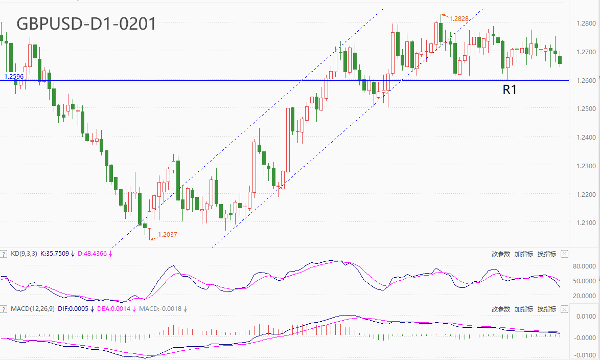 技术角度看,GBPUSD处于中期上涨趋势的横盘震荡阶段,下方R1:1.2597即为近期支撑位。震荡走势已经持续一个半月时间,这段时间里美元指数累计涨幅1.81%,意味着英镑具有远超其它非美货币的抗跌属性,同时又存在补跌的可能性。震荡指标KD的读数处于中等偏下区间,此前快慢线已经向下交叉,短线走势偏空。MACD指标的柱线处于零轴下方,但绝对值偏小,中短期震荡格局显著。综合来看,多数指标认为GBPUSD的震荡格局将会延续,一旦R1被跌破,有可能触发补跌行情。
