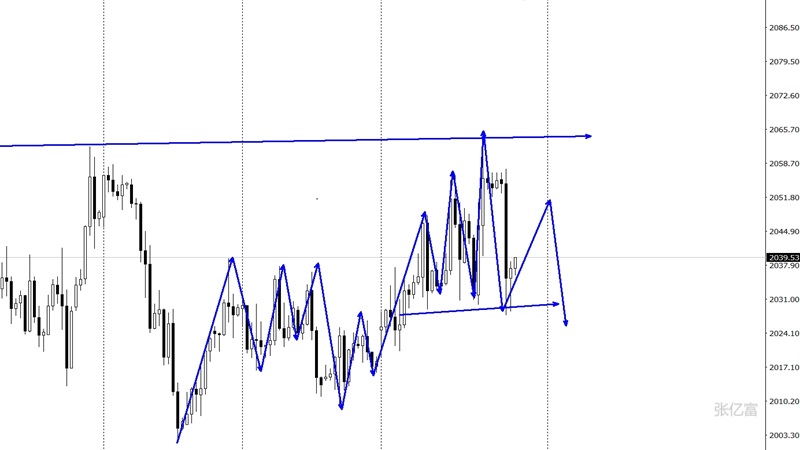 黄金周线级别显示,金价先涨后跌,在触及最高点2065.5美元/盎司遇阻,黄金出现了承压回撤,随后在2027一带企稳震荡,周线级别最终收录一根阳线倒锤头线,留有较长上影线,周线级别表现着高位震荡中。短期趋势上看,黄金在回撤2000美元之后,黄金出现了一波上涨突破走势,当前处于第四波调整与第五波延续阶段,如果下周黄金无法上破前高,将出现失败五浪,进一步出现,ADC第一波随后转跌,所以下周操作预期是震荡下跌。综合以上分析,张亿富认为:大非农数据打压,黄金周一大概率出现承压迹象,周一操作上考虑高空低多策略,上方关注2045-2052美元阻力,下方关注2028-2020美元支撑。