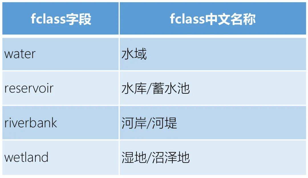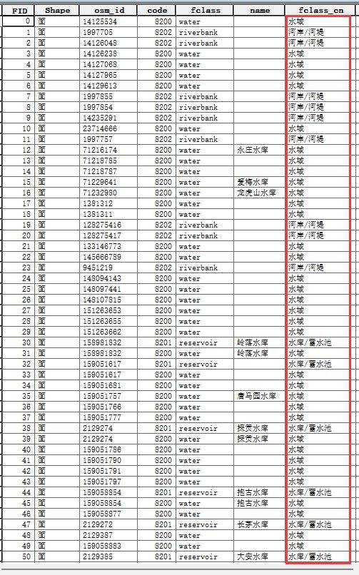 我们先来看看水系面图层,主要是面状水体,比如水库、湖泊等,具体包括下表所示的类型,水系类型是存储在数据属性表的“fclass"这个字段里面。