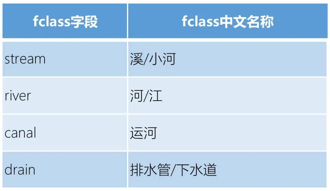 我们先来看看水系线图层,主要是线状水体,包括小河、小溪等,具体包括下表所示的类型,水系类型是存储在数据属性表的“fclass"这个字段里面。