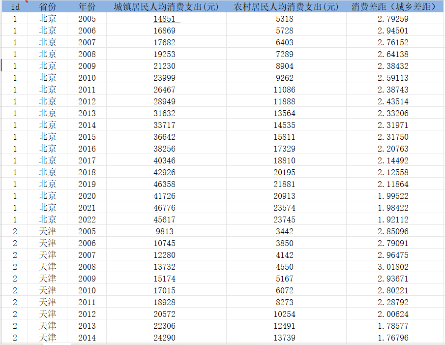 id、省份、年份、城镇居民人均消费支出(元)、农村居民人均消费支出(元)、消费差距(城乡差距)。