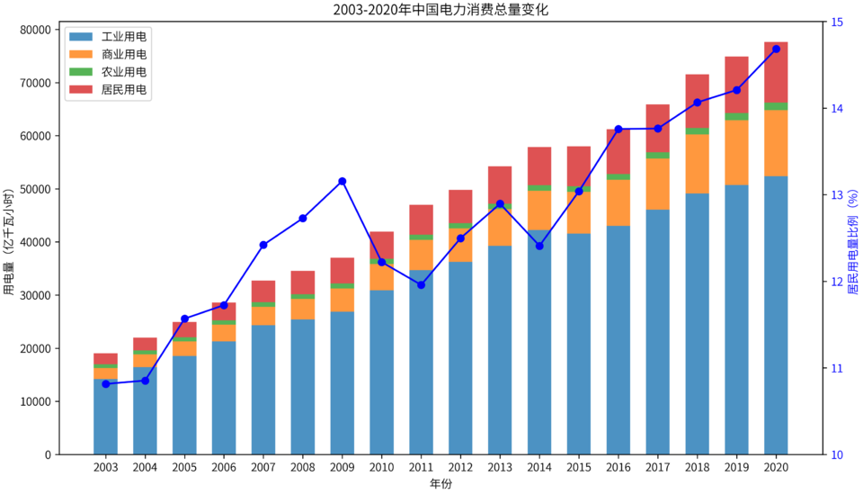 背景描述该数据为我国2003-2020年工业用电、农业用电、商业用电以及居民用电数据集,时间分辨率为“年”,空间分辨率为整个中国。 数据说明数据共有5列,第一列为时间列,表示数据的年份,其他四列分别为工业用电、商业用电、农业用电以及居民用电, 数据单位为“亿千瓦时”。 读取方法import pandas as pddf = pd.read_csv(file_name)可视化效果展示 数据来源国家统计局官网