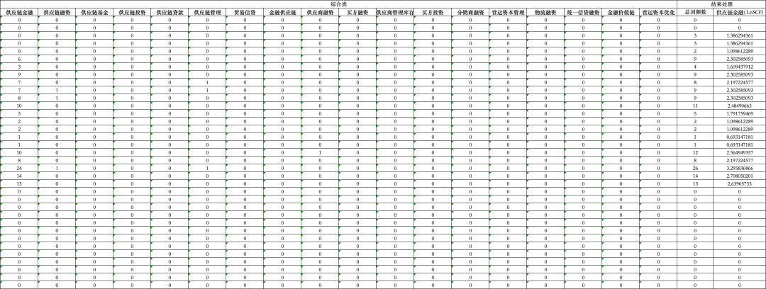 为扩展研究对象,满足更多会员群体的使用需求。本期我们以上市公司2001-2022年的年度报告文本为依据,借助参考文献周兰(2022)的思想来测算供应链金融( LnSCF) 。其中:参照张黎娜等( 2021) ,并结合 Gelsomino et al. ( 2016) 、Chakuu et al. ( 2019) 、Parida et al. ( 2022) 、Huang et al. ( 2022)对供应链金融关键词的不同描述,本文使用供应链金融关键词词频统计的方法来度量企业供应链金融水平,并做对数化处理(总词频加1取对数),具体关键词如表1。