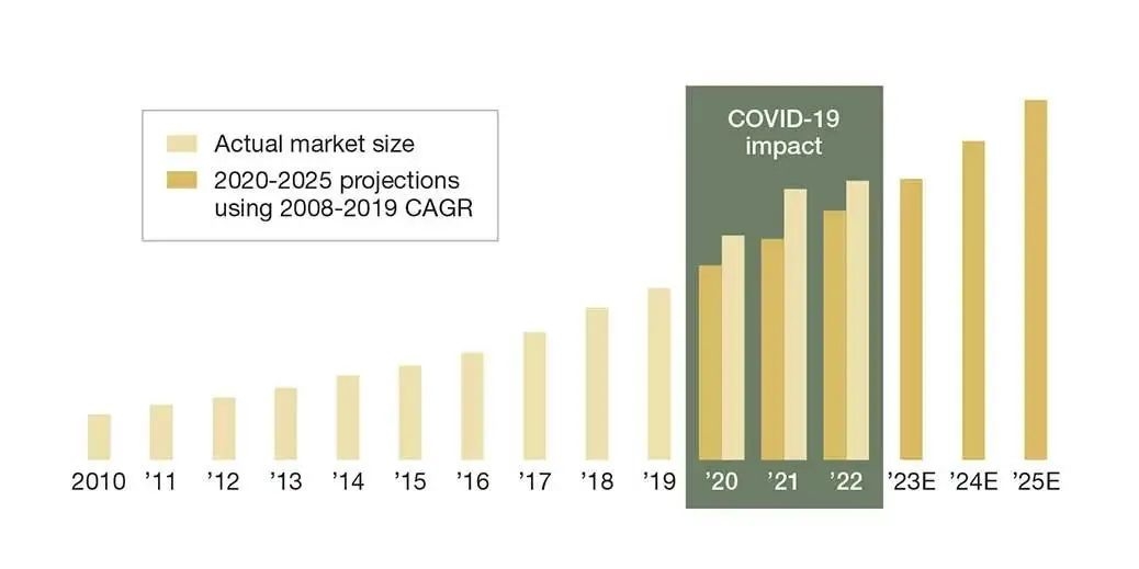 2021-2022年电子商务加速放缓,但正在恢复其长期趋势(全球零售电子商务市场规模(十亿美元))来源:Euromonitor