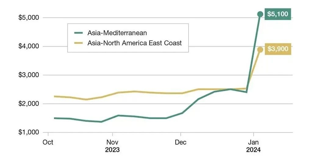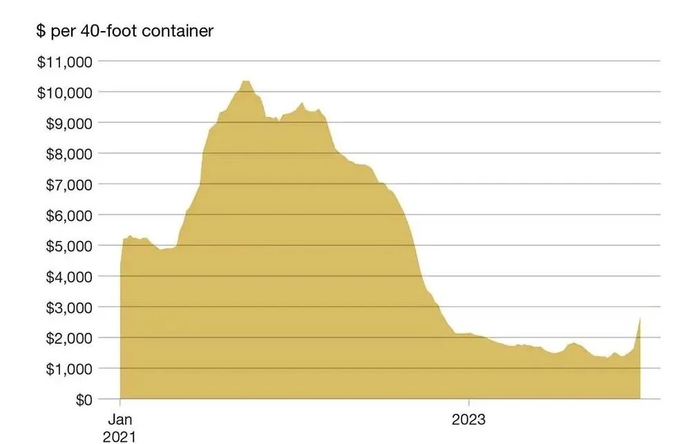 德鲁里航运咨询公司(Drewry Shipping Consultants)的数据显示,由于这种供应链中断,自2023年11月底以来,全球40英尺长集装箱的平均运输成本几乎翻了一番。
