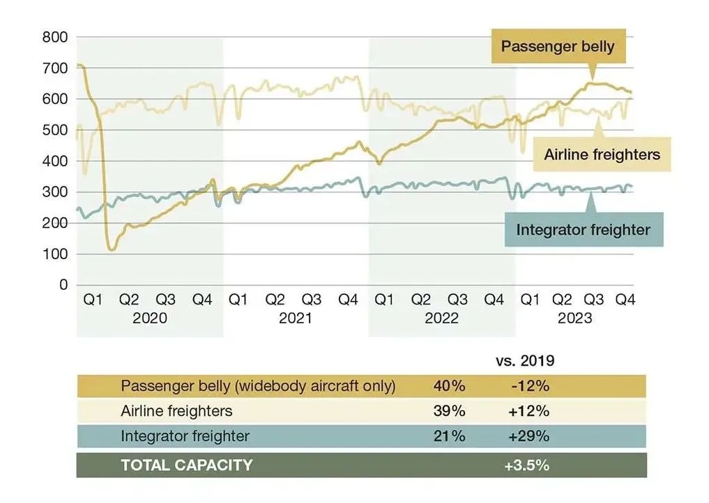 随着客机航线的扩张,客机腹舱运力将增长3.5%,尤其是在亚太地区。根据国际航空运输协会(IATA)的数据,货机和客机腹舱运力的运力分配各占一半,因此,在2024年的大部分时间里,买方市场应该会持续下去。