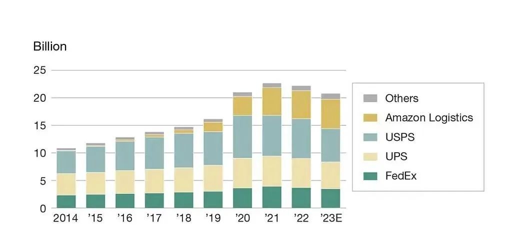年包裹量(十亿)来源:ShipMatrix