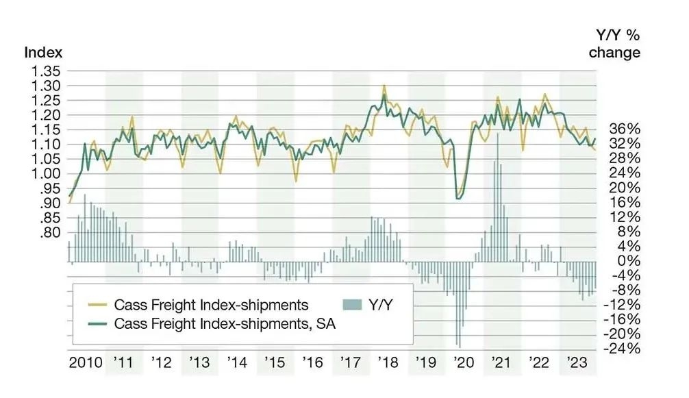 Cass运费指数-2010年1月至2023年12月的出货量(1990年1月=1.00)资料来源:卡斯信息系统公司,ACT研究公司,2024
