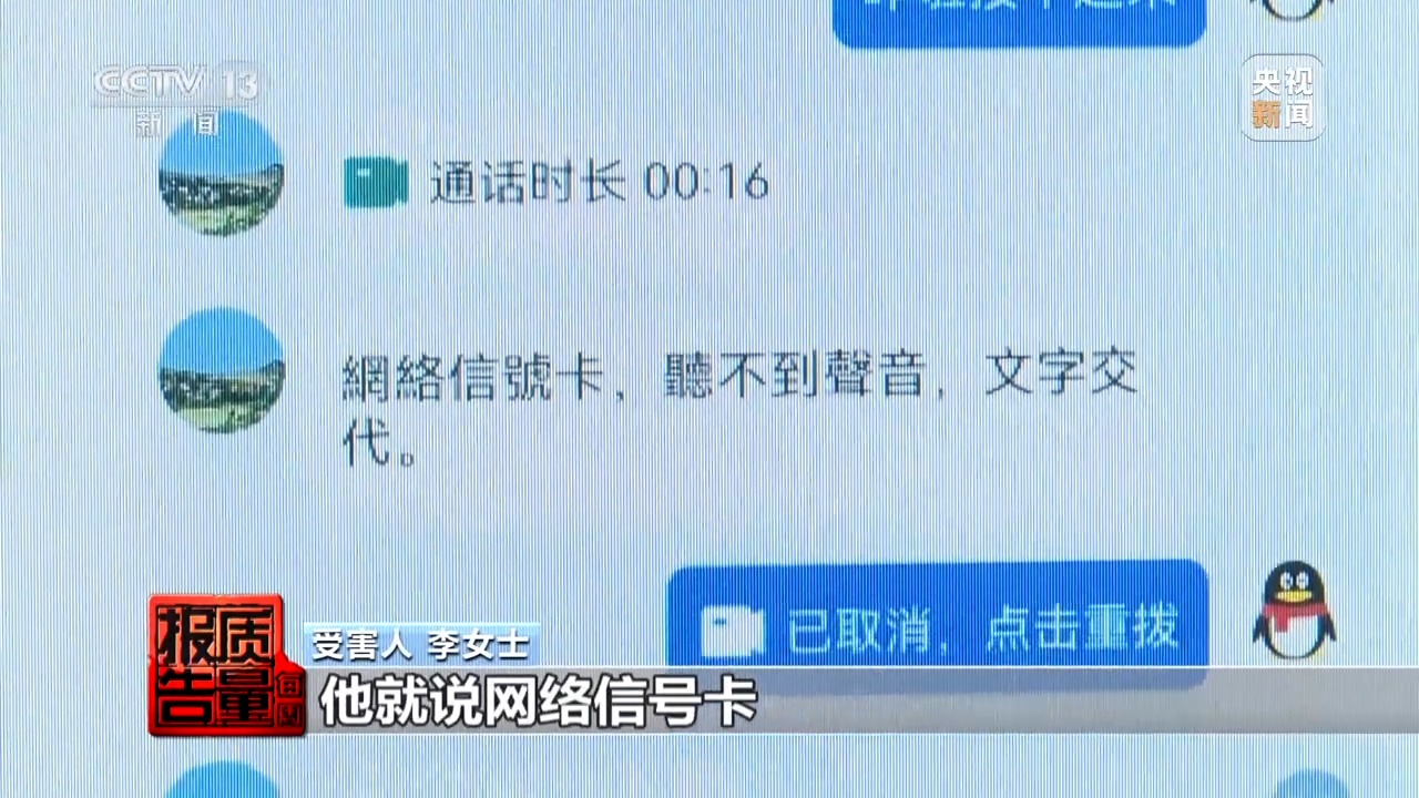 受害人李女士:跟我视频,我没等接起来就没了,紧接着又跟我视频一次,我还是接不起来。第三次给我打视频,我接起来16秒钟看到他的头像,头比较大,背景啥的都看不到,声音听不到,太吵了那里边,他就说网络信号卡,听不到声音,文字交代,他就给我打过来字。