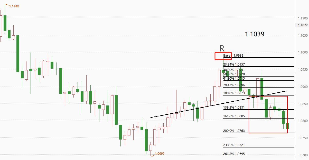 M1代表经济社会最活跃的资金,总量升高则意味着通胀率有升高风险,总量下降则意味着通胀率有降低风险。现阶段大比例下降的M1同比增速,意味着欧元区的通胀率可能比市场预期的降幅更大,这也意味着欧元区经济“硬着陆”。欧央行的货币政策以通胀率和失业率表现为“锚”,如果通胀率降幅超预期,且失业率高于5%的健康水平(最新值为6.4%)。那么欧央行提前降息的概率将大大提高。M3代表经济体系中所有的货币量,既包含活跃的消费,也包含稳定的储蓄。M1大幅下降而M3小幅升高,意味着社会中的资金正在从消费市场转移至储蓄市场。这种变化与当前欧元区较高的基准利率有关,高利率压低了居民的消费意愿和企业的增资扩产意愿。昨日,EURUSD累计跌幅0.37%,最低触及1.0775,今日延续跌势。可见,持续下降的M1同比数据对欧元币值造成显著冲击。