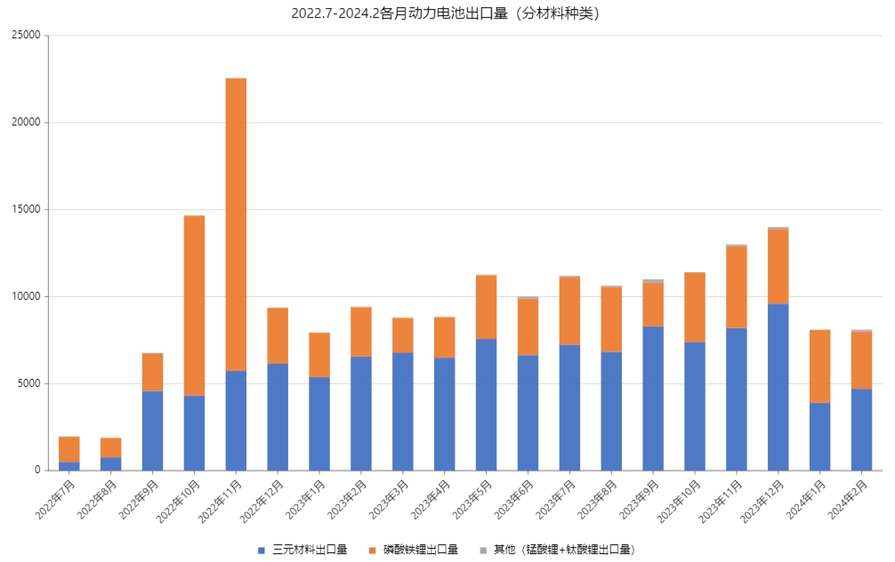 2022.7-2024.2各月磷酸铁锂/三元材料动力电池出口量