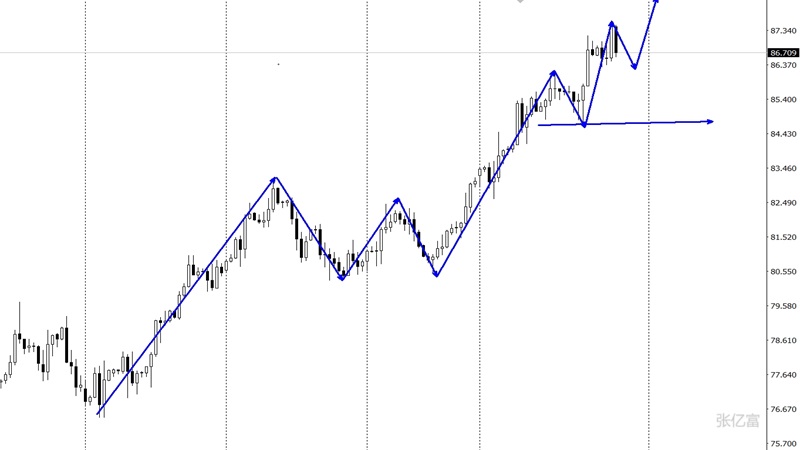 美原油市场上周初开盘在83.56美元/桶,后行情先回落,周线最低给到了82.807美元/桶,后行情震荡拉升,周线最高触及到了87.825美元/桶,后行情整理,周线最终收线在了86.864美元/桶,后行情以一根上影线稍长于下影线的中阳线收线,而这样的形态收尾后,原油延续看涨思路。4小时力一波探高后跌破中轨,几乎将此前的大阳线上涨空间回吐。重新回到84.60起涨低点附近争夺。目前是日线和周线趋势看涨,短线回踩当作是多头的修正蓄势。综合以上分析,张亿富认为:原油整体属于多头趋势中,今日操作上考虑回撤布局多单为主,高空为辅,上方关注86.8-87.6美元阻力,下方关注84.5-83.6美元/桶支撑。