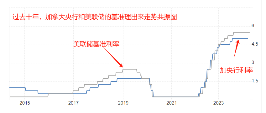 本周三21:45,加拿大央行将公布4月份利率决议结果,市场普遍预期其将维持5%的基准利率不变。加拿大宏观经济与美国宏观经济共振,两个国家中央银行的货币政策趋同。将过去十年加拿大央行基准利率与美联储基准利率进行叠加后发现,两者呈现出高度的共振特征。统计数据表明,研判加拿大央行货币政策,也是在研判美联储的货币政策。由于市场对于美联储首次降息的时间点设定在6月份,所以6月份之前,加拿大央行大概率也不会启动降息操作。