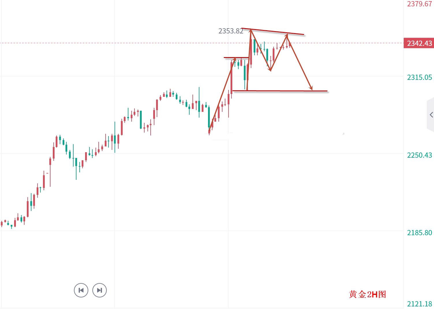 早间在较短时间内自低到高上涨50的空间,多方势能消耗殆尽,随后的欧美盘进入整理运行,美盘中最低触及2318,自日内高点回撤25美元左右,最终价格收于2338附近。