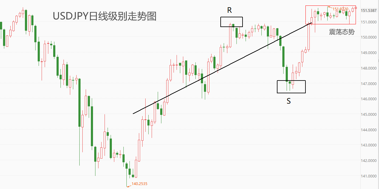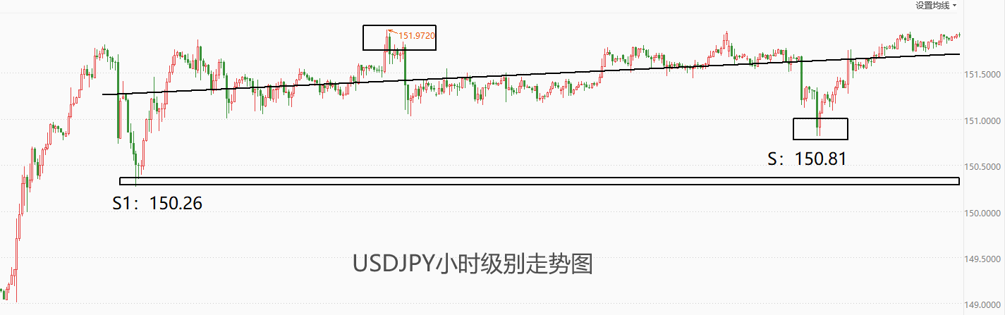 小时级别来看,USDJPY同样处于横盘震荡状态,只是重心稍稍有所上移。黑色回归线上方的阻力位至下方的支撑位所需要的时间较长,意味着USDJPY下一轮回落不会在短时间内出现。下方第一支撑位S:150.81,第二支撑位S1:150.26,一旦第二支撑位被跌破,则趋势由多转空的概率大增。