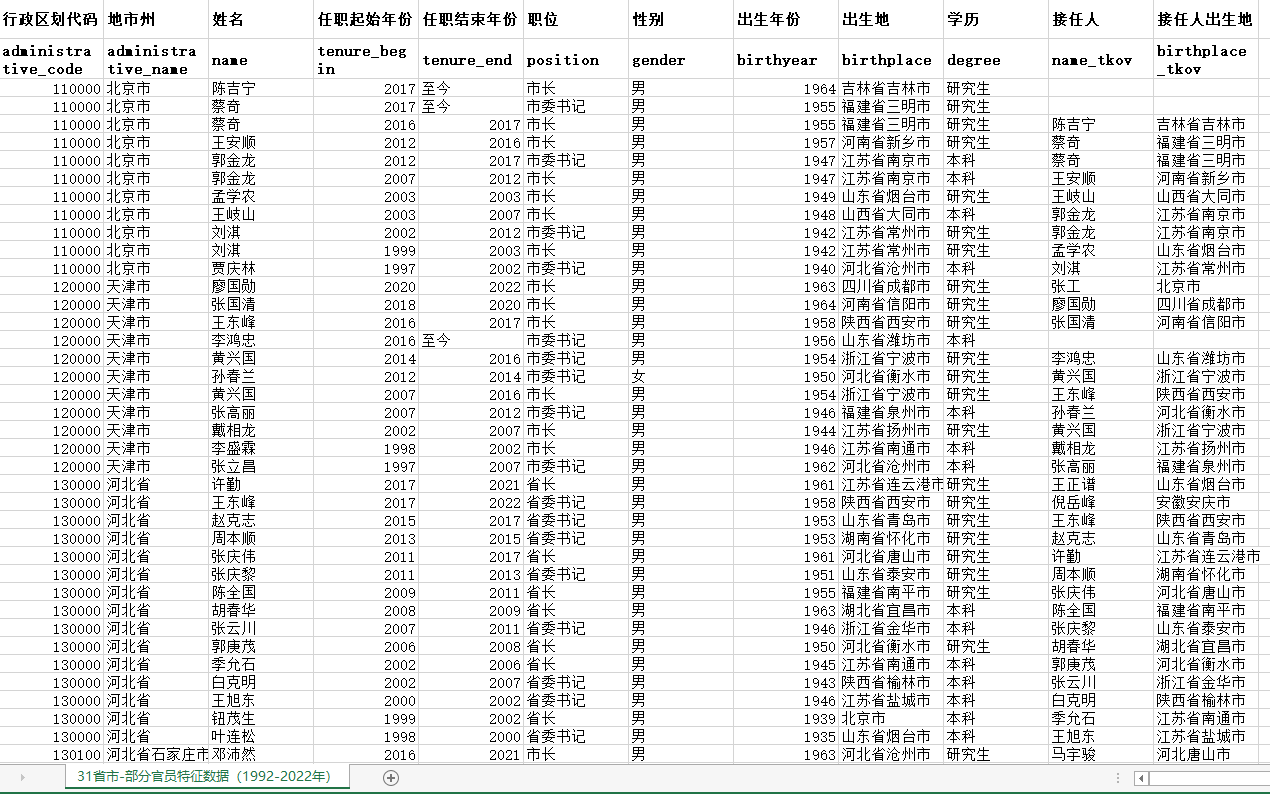 本数据收集了1992-2022年间全国各省份地市州地方历任官员(包含省长、省委书记、市长、市委书记、州长、州委书记等)的特征信息,主要包含任职起始年份、职位、性别、出生年份、出生地、学历、接任人、接任人出生地等。