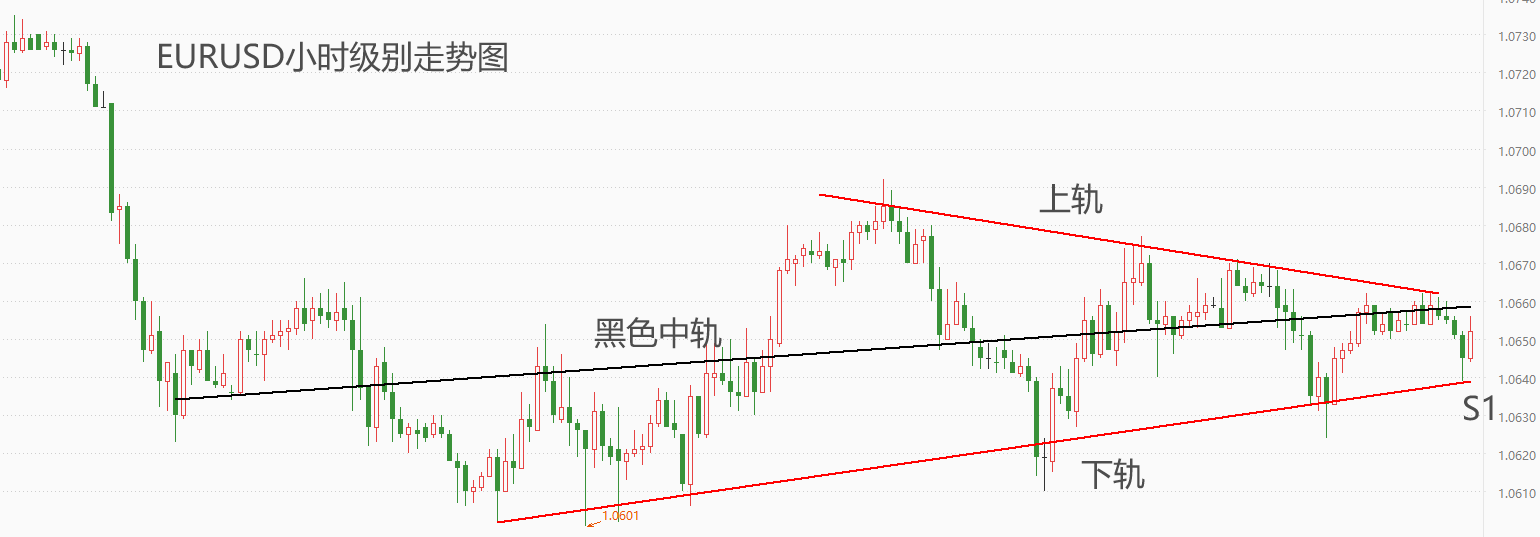 下图为EURUSD小时级别走势图。最近的200根K线来看,市价处于横盘震荡态势,且震荡态势存在收口迹象,一旦收口达到极限,单边走势即将出现。考虑到EURUSD日线级别处于空头趋势,且美元指数近期表现强势,预计未来的单边走势,向下突破的概率较高。回到小时级别的分析,当前市价处于上轨与下轨之间,距离上轨较近,日内触顶回落概率较高。