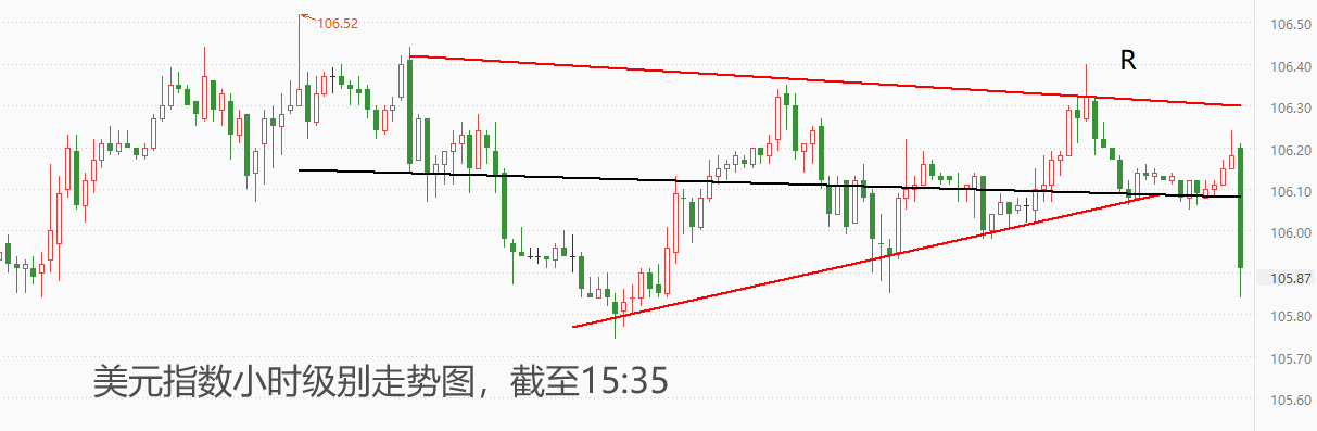 下图为美元指数小时级别走势图。由于刚刚公布的德国PMI数据表现良好,所以美元指数受到欧元走强的反向抑制而快速下跌。技术角度看,下方的红色支撑线已经与稍早的K线交叉,支撑位不再发挥作用,后市跌幅可能较大。上方阻力位是图中R所在上轨线,当前最新值约为106.3点。最近200根线来看,行情整体呈现出震荡态势,即便美元指数短期有回落风险,在中期仍有较大概率触底反弹,并最终向黑色回归线运动。