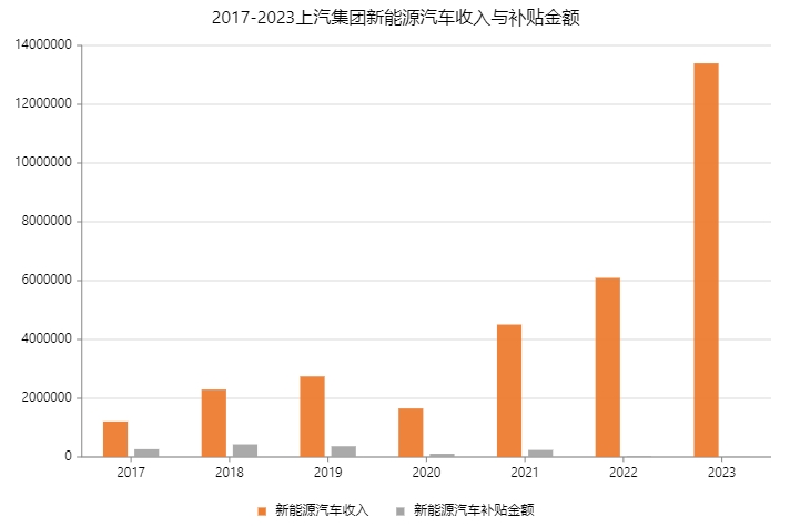 2017-2023上汽集团新能源汽车收入与补贴金额
