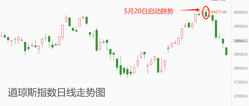 美联储褐皮书利多美元指数的同时,利空美国股票市场。隔夜美国三大股指均收跌,其中道琼斯指数的跌幅最为显著。5月20日触及阶段性高点40077.4至今,累计跌幅将近4%,且阴K线占比极高。道琼斯指数的下跌虽然有褐皮书的助推,但主要原因是权重个股的集体回调,典型的是麦当劳,年内回调幅度已经超过15%,对股票指数形成严重拖累。长周期看,美股每一次的下跌都有可能是“黄金坑”,随着股市信心的恢复,股票指数总是能够再创新高。