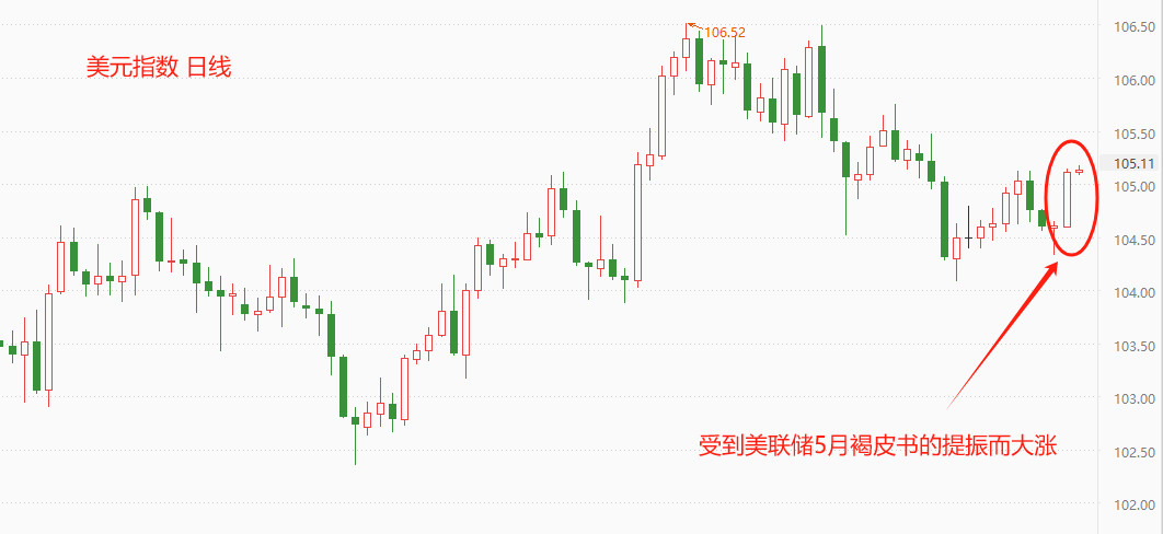受到褐皮书鹰派表态的影响,昨日,美元指数大涨0.48%,最高触及105.15,创出5月15日以来新高。本周一收出小阴线,本周二收出长下映的十字星,本周三以长阳线收盘,短期行情走势呈现出标准的触底反弹特征。5月16日形成本月最低点,当时报价为104.08点,按照今日盘中价格105.11计算,累计涨幅已经达到0.99%。从近两月的走势结构看,美元指数的高点依旧在不断降低,低点不断刷新纪录,空头趋势尚未终结。自5月16日至今的反弹走势能否演变为反转,取决于降低预期是否还会卷土重来。