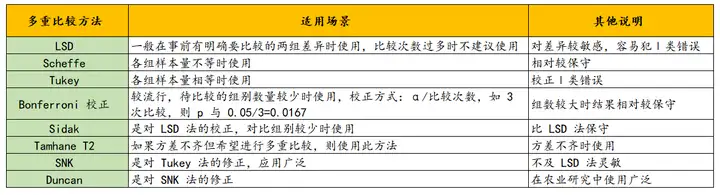 在方差分析发现总体存在显著差异后,使用事后多重比较来确定哪些组之间存在显著差异,常用于两两之间对比,比如不同学历(专、本、硕)对购买意愿有差异,进一步分析专、本之间的购买意愿差异、专、硕之间的购买意愿差异、本、硕之间购买意愿差异。