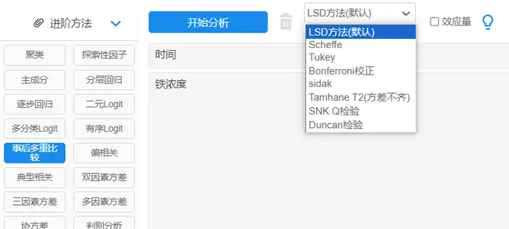 以SPSSAU为例:【进阶方法】→【事后多重比较】;
