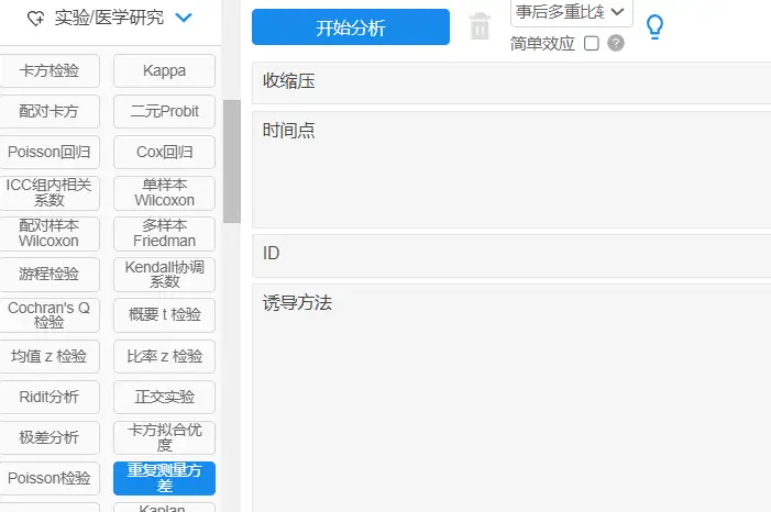以SPSSAU为例:【实验/医学研究】→【重复测量方差】;