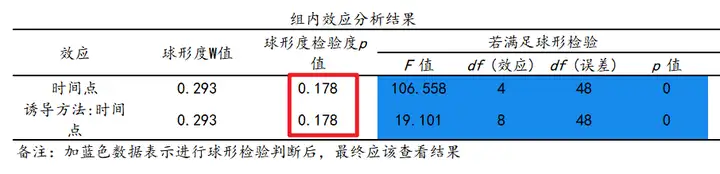 球形度检验中p值大于0.05说明接受原假设,通过球形度检验,组内效应直接看“满足球形检验”即可。