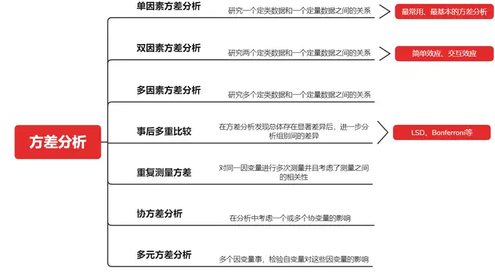方差分析(ANOVA)是一种用于检验两个以上样本均数差别的显著性统计方法。根据不同的研究设计和数据类型,方差分析可以分为以下7种类型。