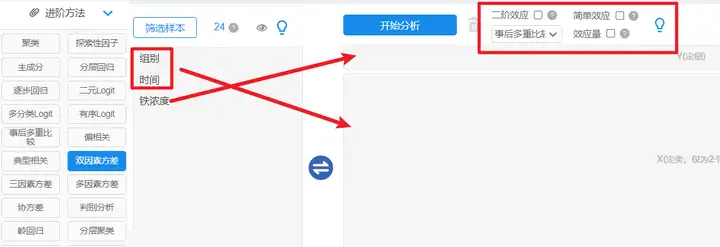 以SPSSAU为例:【进阶方法】→【双因素方差】;