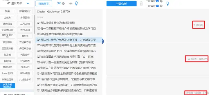 将变量拖拽到对应的分析框内,点击开始分析(PS:这里的平行性检验是指模型中建立分别每个X与协变量间的交互项)。