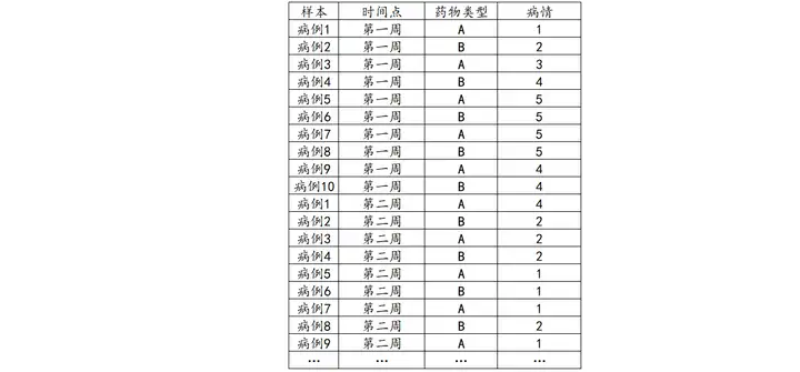 重复测量数据是指同一批样本(病例)在不同的时间点测量了多次数据,所以数据格式比较特殊,比如有10个样本,并且测量3个时间点。那么就一定会有10*3=30行数据,举例如下: