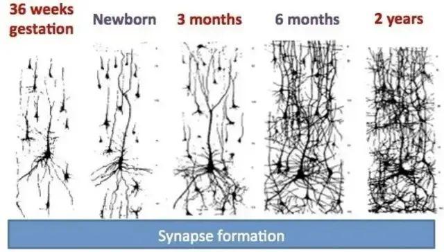 36 周的胎儿、新生儿、3 个月、6 个月、2 岁时,大脑的神经突触网络