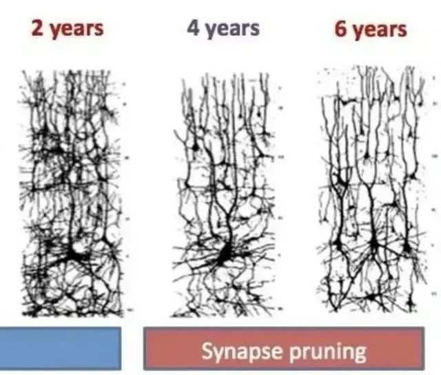 从婴儿到两三岁的孩子,整天东摸摸,西爬爬,大脑疯狂输入信息,形成了丰富而纷乱的神经网络。