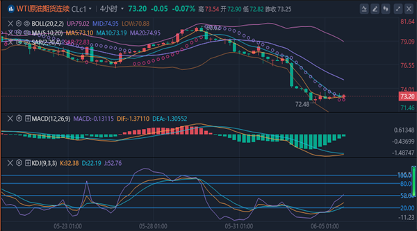 【原油技术面分析】:原油日线来看连续5个交易日下跌收阴使得原油从80关口跌至72附近创下了4个月以来的新低,目前虽然没有明显的触底信号,但是短时间大跌幅原油有反弹修正的需求,上方阻力看至76关口附近。四小时线来看,周一一波大跌后,周二仍然持续小幅走跌至72.48美元/桶,目前反弹至73上方,短线有反弹的迹象,目前油价运行在布林带中下轨之间,KDJ金叉后向上发散运行,MACD的DIF线在DEA线下方拐头,绿色能量柱缩量,短线走势偏反弹。所以原油受欧佩克+周末制定的逐步增加石油供应的影响,目前大幅下跌至4个月以来的低点,短线走势来看有反弹的需求,因此日内操作上暂时不考虑追空。综合来看,今日原油短线操作思路上建议回调做多为主,反弹做空为辅,上方短期重点关注74.5-75.0一线阻力,下方短期重点关注72.0-71.5一线支撑。