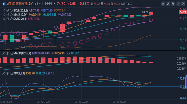 【原油消息面分析】:周三(6月5日)数据显示美国原油和燃料库存增加,同时,对美国美联储 9 月份降息的希望超过了对需求的担忧,引发油价从四个月低点反弹,并上涨超1%。#原油收盘#WTI 7月原油期货收涨0.82美元/桶,涨幅大约1.12%,收报74.07美元/桶。截至发稿,现报74.11美元/桶,涨幅1.17%。