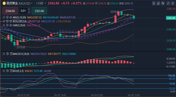 【黄金消息面分析】:周三(6月5日),黄金价格继续区间波动并上涨,与周二的价格走势形成鲜明对比,此前美国公布的经济数据好坏参半,可能促使美联储降低借贷成本。美国国债收益率下降,美元上涨,但未能抑制黄金的涨势。现货黄金收涨1.22%,收报2355.11美元/盎司;COMEX黄金期货收涨1.18%,收报2375.20美元/盎司;COMEX白银期货收涨1.76%,收报30.137美元/盎司。