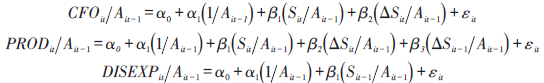 然后分别用公司当年实际经营现金净流量、实际生产成本和实际酌量性费用减去估计出的正常值,由此得到异常经营现金净流量(AbCFO)、异常生产成本(AbPROD)和异常酌量性费用(AbDISEXP)。正常值估计模型如下: