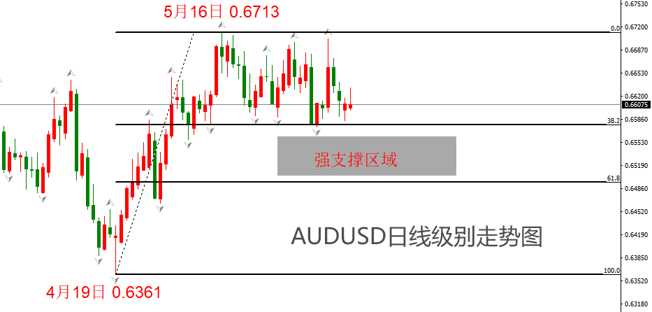 4月19日,AUDUSD从最低0.6361开启涨势,5月16日上涨至0.6713,不足一个月的时间,累计涨幅352基点。本论上涨的主要原因是美元指数下跌,而美元指数下跌的主要原因是美国非农就业报告和CPI数据的爆冷,令降息预期在4月份下旬至5月上旬异常强烈。5月16日至今,AUDUSD呈现出震荡态势,下限在0.382黄金分割附近,表明此处支撑有效。考虑到美联储在几年启动降息的概率较高,美元的核心支撑因素将消失,澳元受到反向提振的概率较高。AUDUSD在触及图中强支撑区域后反弹的概率较高。