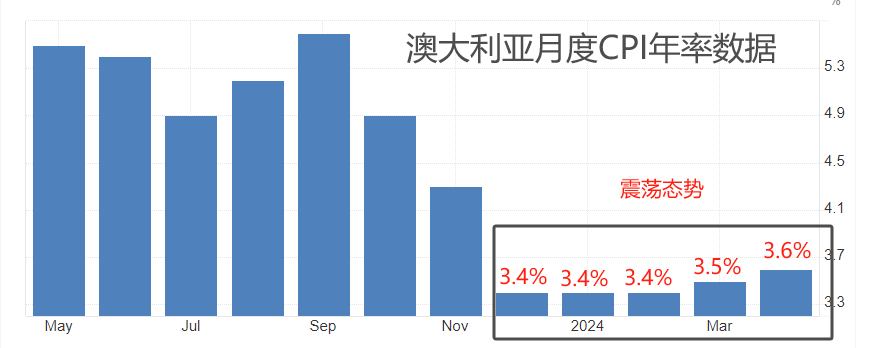 今年4月份最新月度CPI年率为3.6%,相比前值3.5%提高0.1个百分点。最近五个月,澳大利亚月度CPI年率保持在3.4~3.6%较窄区间内,震荡特征显著。这就是澳洲联储在政策声明中提到的“但在最近的数据中,下降的步伐有所放缓”的问题。如果震荡态势延续,意味着澳洲联储当前的基准利率无法有效遏制物价涨幅,央行可能选择重启加息。