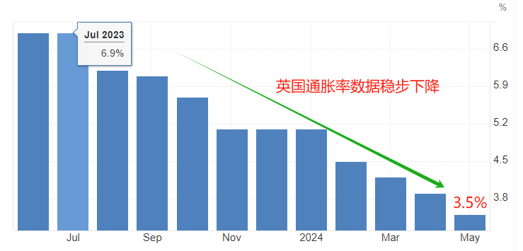 ATFX汇市:据英国统计局数据,英国5月核心CPI年率为3.5%,低于前值3.9%;英国5月名义CPI年率为2%,低于前值2.3%。核心CPI年率和名义CPI年率相比前值分别下降0.4个百分点和0.3百分点,意味着英国的通胀率仍处于快速下降状态。按此速率计算,核心CPI年率将会在3~4个月后达到2%的长期调控目标。中央银行往往会提前行动,不会在通胀率达到既定目标后才开始降息。据此判断,5月份的CPI数据公布后,市场人士对于英央行降息的预期将大增。