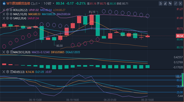 【原油消息面分析】:周四(6月20日)亚市早盘,国际油价窄幅震荡。布伦特原油期货主力合约目前交投于每桶84.35元,美国原油主力合约目前报每桶80.52美元。油价周三盘中一度刷新了近七周高点,夏季需求乐观和对冲突升级的担忧抵消了一份行业报告称美国原油库存意外增加的影响,不过尾盘回吐了涨幅。